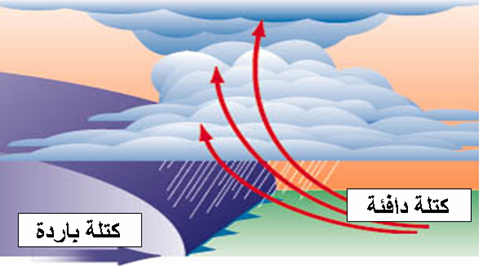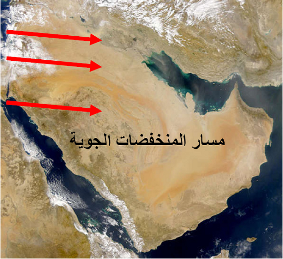 أحياناً يعقب أو يصاحب تلك العواصف الرملية أمطار سيما وأن العواصف غالباً ما تتولد بإذن الله تعالى في مقدمة المنخفض الجوي Depression الجبهة الدافئةWarm Front وكذا بمؤخرة المنخفض الجوي الجبهة الباردةCold Front (شكل رقم 3) وبالتالي تكون الأمطار في بدايتها ملوثة بذرات الرمل والطين وذات لون بني أو أحمر حيث تقوم قطرات الماء بتنقية الجو من تلك العوالق وكلما كانت الأمطار كثيفة كلما تخلص الجو من كميات أكبر من العوالق الترابية وبالتالي يقوم المطر بدور إيجابي في تسريع نهاية العاصفة وتقليل فترة طيران الحبيبات فوق سطح الأرض وهذا غاية ما يتمناه الناس حيث الدور المزدوج للمطر تنقية الجو وتنظيف للأرض. وفي حالة عدم وجود مطر مصاحب لتلك العاصفة الترابية فإن العاصفة تأخذ دورها في النمو بشكل كامل (مرحلة الصبا، يليها مرحلة النضج، وأخيراً مرحلة الشيخوخة) – دون تدخل مطري – وكل مرحلة تمتد لدقائق أحياناً أو لساعات أحيانا أخرى وربما لأيام وهذا نادر. وبالنظر للشكل رقم 4 المصاحب نجد والله أعلم أن عاصفة الثلاثاء الترابية جاءت مصاحبة للجبهة الباردة.